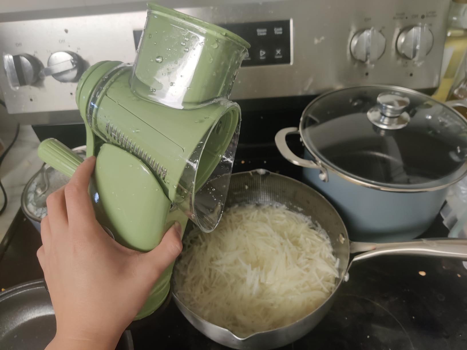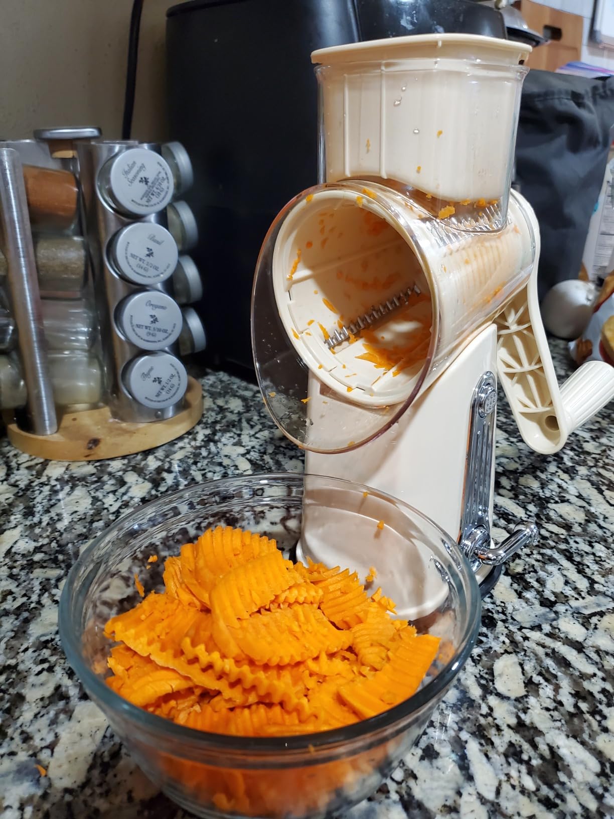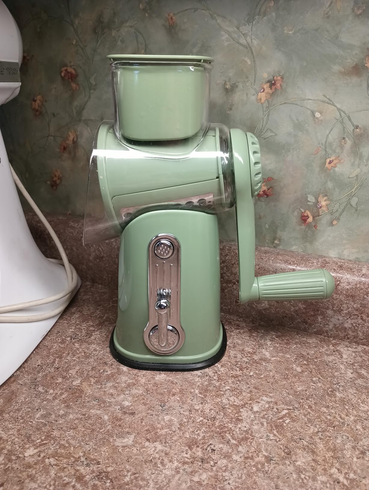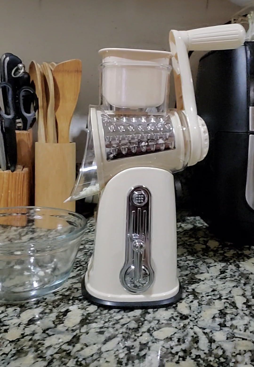 It handles cheese, vegetables, and even chocolate quickly, and the multiple blades let you slice or shred in different thicknesses. I used it to grate cheddar for mac and cheese, slice zucchini for a vegetable stir fry, and shred potatoes for hash browns. The suction base keeps it steady while turning the handle, which makes it safer than traditional hand graters